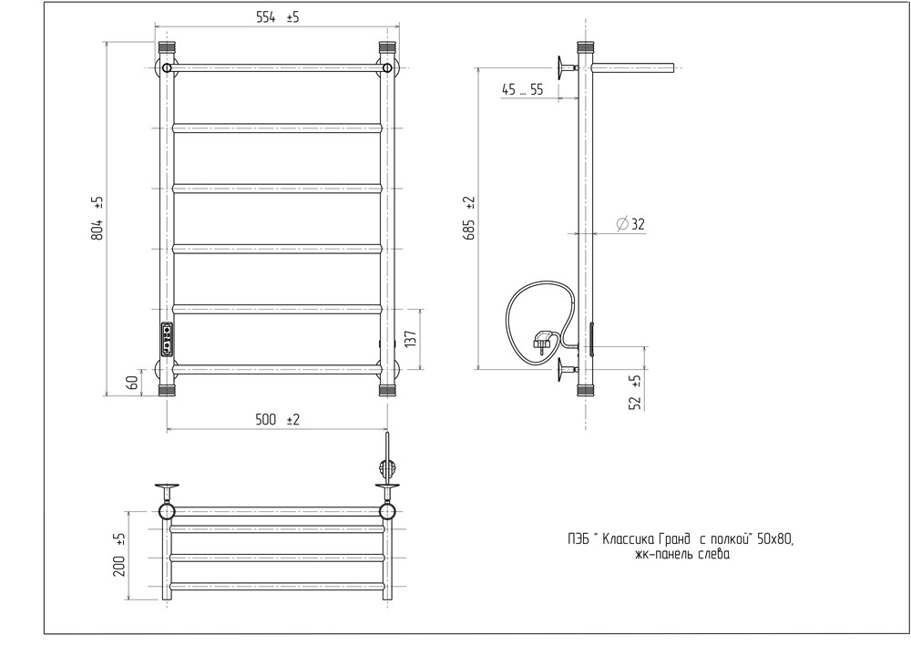 Полотенцесушитель электрический Классика Гранд с полкой 50-80, 190 вт (К-ЖК панель, Справа, Чёрный матовый)