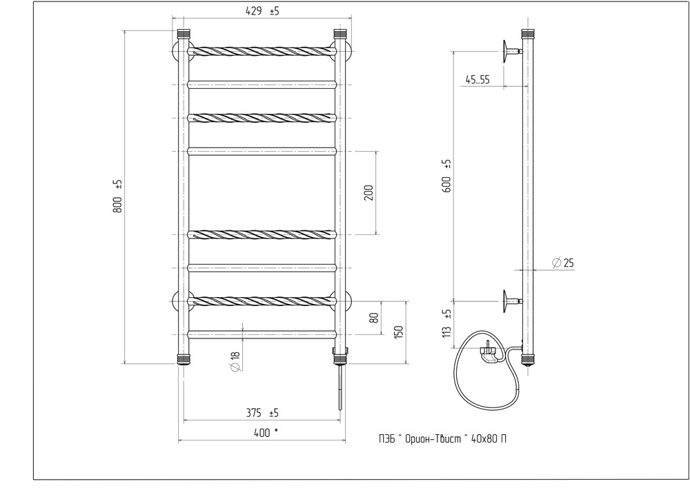 Полотенцесушитель электрический Орион Престиж Твист 40-80 (К-кнопка, Справа)